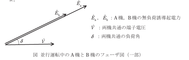 A機及びB機の2台の三相円筒形同期発電機を共通の母線に接続して並行運転を行う。この共通母線に負荷を接続して,両機とも遅れ力率にて,また両機の負荷角が等しくなるように並行運転を行うと両機のフェーザ図の一部が図のようになった。この運転状態の発電機について,次の問に答えよ。