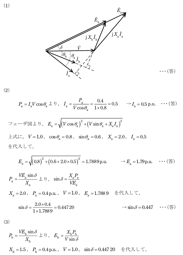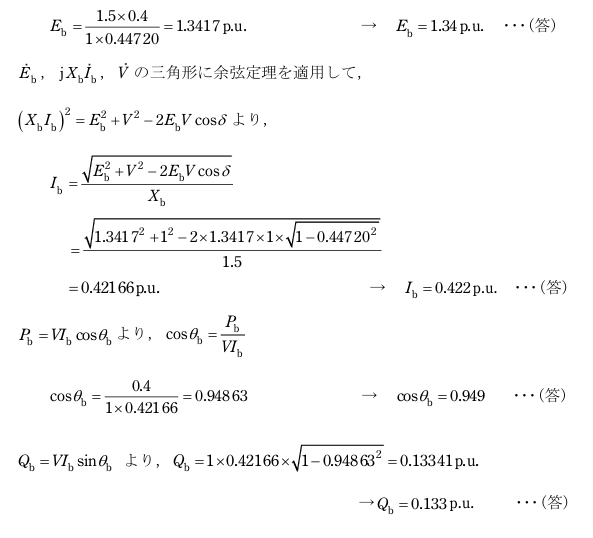(3) また,そのときのB機の有効電力を Pb = 4MW として,B機の\(\dot{E}_b\) [p.u.]を求め,さらに\(\dot{I}_b\) [p.u.],cosθb ,及びB機が分担する無効電力 Qb [p.u.]の値を求め