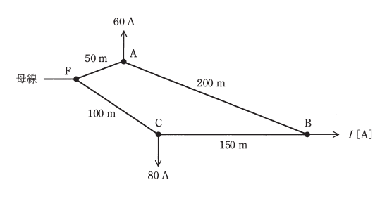 母線 F 点の線間電圧 107 V と B 点の線間電圧 96 V の差は,11 V である。単相 2 線式なので,11 V の電圧降下は,往路と復路に均等に分かれる。つまり,電線 1 条当たりの電圧降下は 11 V の半分の 5.5 V となる。