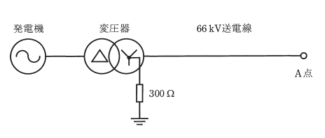 図に示すように,発電機,変圧器と公称電圧 66 kV で運転される送電線からなる系統があるとき,次の(a)及び(b)の問に答えよ。ただし,中性点接地抵抗は図の変圧器のみに設置され,その値は 300 Ωとする。