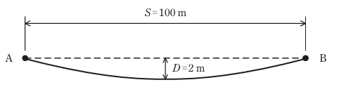 図のように高低差のない支持点A,Bで支持されている径間Sが100mの架空電線路において,導体の温度が30℃のとき,たるみDは2mであった。