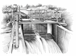 水路式発電所は河川の水を取り入れ、比較的長い水路で発電所に導いて落差を得る方式であり、その主な設備としては、取水口、取水ダム、沈砂池、導水路、ヘッドタンク、水圧管、水車、発電機、放水路及び放水口からなる。